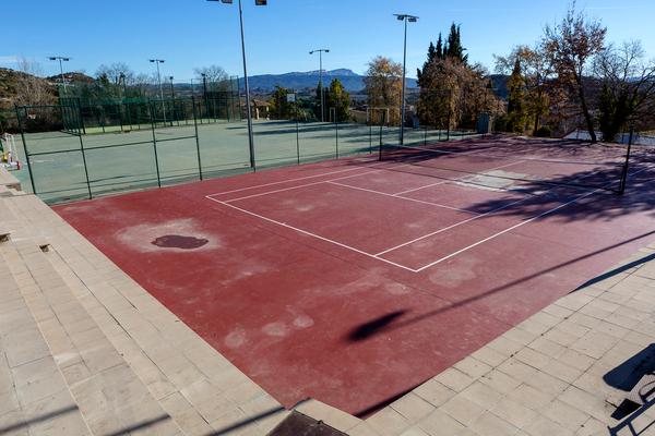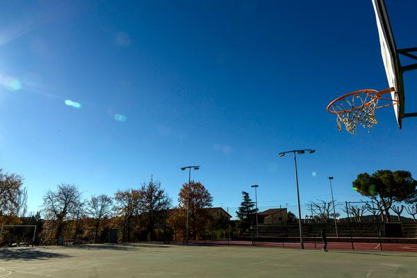 En el exterior se encuentran las instalaciones polideportivas al aire libre con una pista de tenis, dos pistas polideportivas y pistas de pádel. Además hay un pequeño parque infantil.
